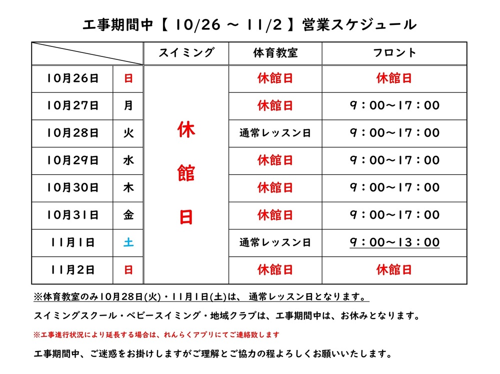 | 2025年10月20日 | プール工事に伴う休館日のお知らせ |