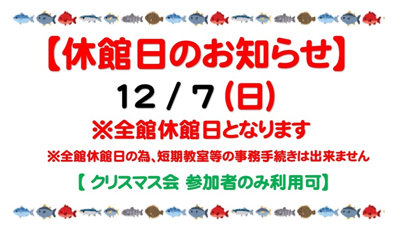 2025年12月06日 全館休館日のお知らせ【12月7日】 12月7日(日)は、休館日となっております。※クリスマス会参加者のみ利用可 お間違いのない様、よろしくお願いします。 ※全館休館日となりますので短期教室等の手続きは、出来ませんのでご了承ください。 【スクールカレンダーは、ホームページでも確認出来ます】